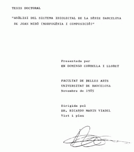 • Resum de (obra): Corbella, Domènec, 1946- Anàlisi del sistema idiolectal de la sèrie Barcelona de Joan Miró (morfogènia i composició) (Tesi doctoral) [autor]